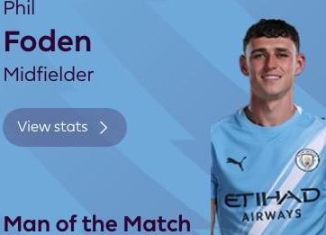 梅开二度,福登当选曼城vs利兹联全场最佳球员